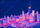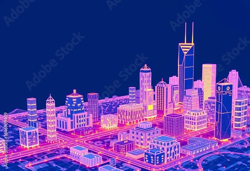 Abstract low-poly wireframe smart city model on a blue background Futuristic urban landscape illustration, background, concept
