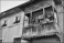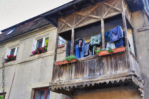 >Plakat>Urokliwy drewniany balkon (weranda) starego budynku, ozdobiony kolorowymi kwiatami i suszącym się praniem, odzwierciedla rustykalną i zamieszkałą atmosferę z zabytkowym charakterem architektonicznym.
