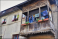 Fototapeta - Urokliwy drewniany balkon (weranda) starego budynku, ozdobiony kolorowymi kwiatami i suszącym się praniem, odzwierciedla rustykalną i zamieszkałą atmosferę z zabytkowym charakterem architektonicznym.