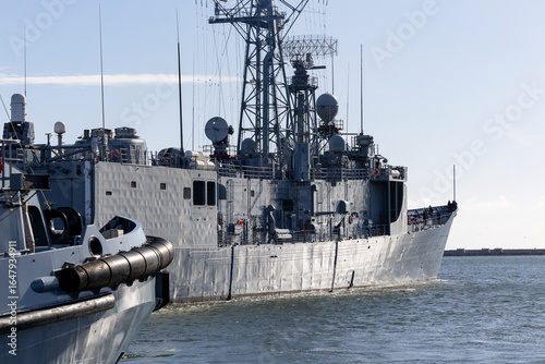 Fototapeta - Okręt wojenny na patrolu na morzu. Statek wojskowy