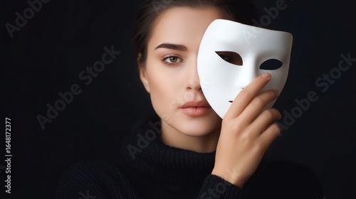 Fototapeta - Woman removing white mask revealing emotionless expression, symbolizing concealed identity, inner truth and the complexity of self-perception and vulnerability