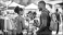Fototapeta - A father and two daughters at an outdoor market with backpacks and shopping bags smiling at each other