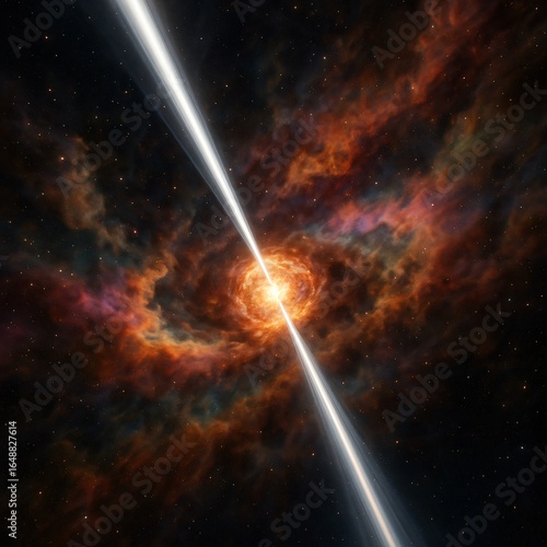 Fototapeta - Photorealistic 3D Scientific Rendering of a Gamma-Ray Burst from a Collapsing Hypernova with Energy Beams and Scattered Cosmic Dust
