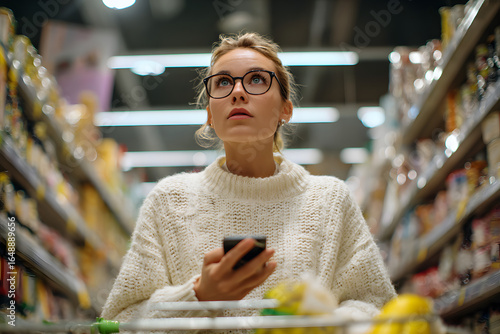 Fototapeta - Curious young woman wearing eyeglasses in a supermarket, looking up at the shelves with a thoughtful expression while holding her mobile phone.