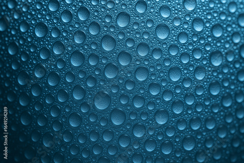 Fototapeta - Macro close up of blue water droplets densely covering a textured background under even lighting