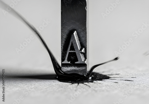 Fototapeta - Extreme macro of single typewriter key striking ink ribbon against paper, showing texture of fibers and ink smudge