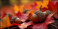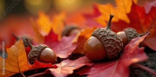 Shiny brown acorns scattered on a bed of crimson and gold autumn leaves , crisp, detal