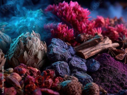 Vibrant colorful correspondences of natural mineral stones flowers and wood textures in a dynamic arrangement