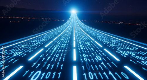 Fototapeta - A high speed data highway of binary code flowing towards a futuristic city skyline. Represents information transfer, big data, internet speed, and modern technology.