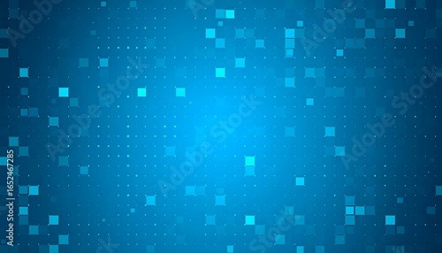 A vibrant blue backdrop showcases a complex pattern of overlapping squares and dotted lines, creating a dynamic and technological aesthetic.