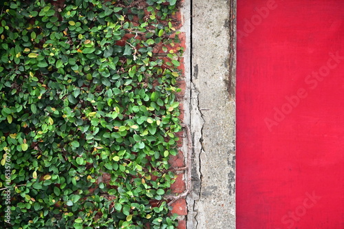 >Plakat>Dense ivy climbing plants covering building wall contrasting with red brick surface. Weathered architecture showing cracks and aging with natural vegetation.