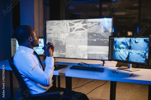Fototapeta - African American security officer or dispatch uses computer and walkie talkie, looks at screens