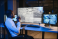 African American security officer or dispatch uses computer and walkie talkie, looks at screens