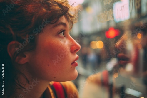 Fototapeta - Close-up of an individual deeply engaged in their reflection in a shop window. The vibrant city life buzzes softly in the background, creating a contrast of stillness and movement