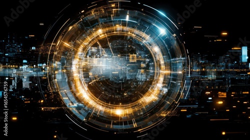 Fototapeta - Complex technological visualization with glowing elements and cityscape backdrop