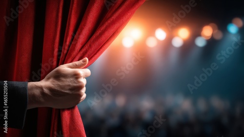 >Plakat>A hand grips the edge of a red theater curtain, ready to reveal the upcoming performance. The audience waits in anticipation, surrounded by vibrant stage lights that illuminate the air.