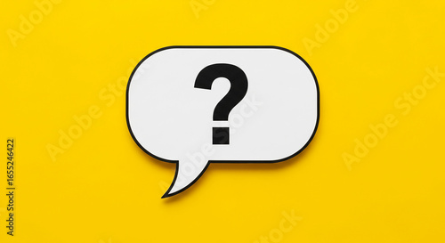 Fototapeta - White speech bubble with black question mark on yellow background, showcasing uncertainty, inquiry, or a need for information, ideal for FAQ pages or help sections
