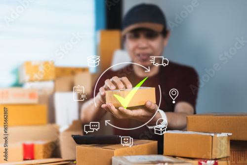Fototapeta - E-commerce seller confirming packed order with digital logistics icons for delivery status, checklist, and order dispatch process