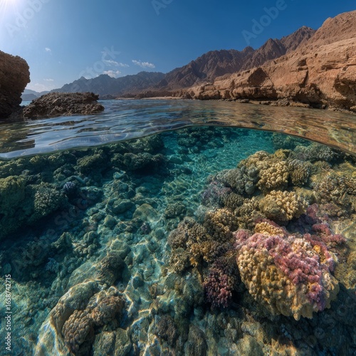 Fototapeta - Vibrant coral reef ecosystem near rocky coastline in clear blue waters during sunny day