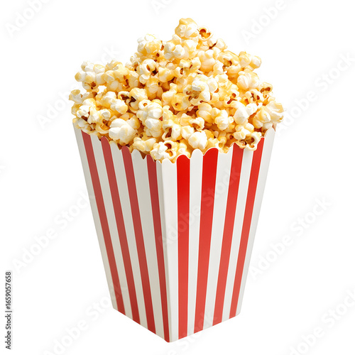 A classic red and white striped container overflowing with delicious golden buttered popcorn, isolated on a white background for movie night.