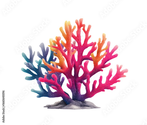 >Plakat>Vibrant coral reef branch. Colorful, stylized coral with branching formations in shades of pink, orange, yellow, and blue. Base is light gray. 3D-rendered look