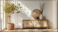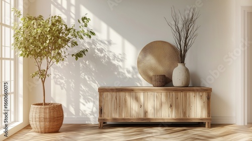 Fototapeta - A room featuring a wooden cabinet with decor and a plant in a woven basket near a window light