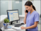 Woman in medical uniform is receiving a call at desk.