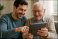 Young man assisting his elderly father while using a tablet computer, sharing a moment of joy and connection