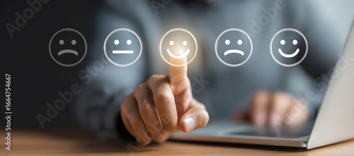 Fototapeta - a man using a laptop, his finger pointing to a virtual smiley face with various emotion signs like happy, sad, or neutral, representing customer experience satisfaction
