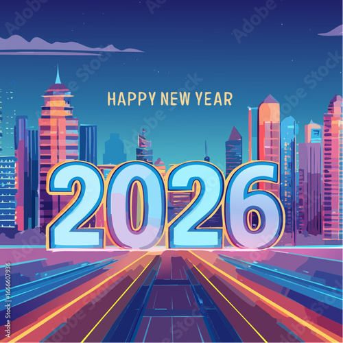 Fototapeta - Wektor „Happy New Year 2026” w stylu cyberpunk, neonowe kolory, futurystyczne cyfry, tło miasta nocą, dynamiczne linie.