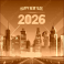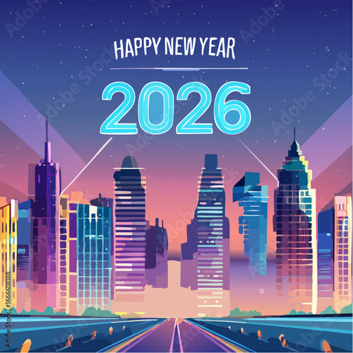 Wektor „Happy New Year 2026” w stylu cyberpunk, neonowe kolory, futurystyczne cyfry, tło miasta nocą, dynamiczne linie.