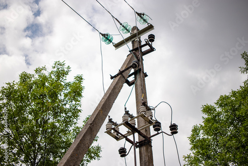 Fototapeta - Utility pole with electrical lines and green trees against a cloudy sky in a rural setting