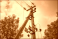 Utility pole with electrical lines and green trees against a cloudy sky in a rural setting