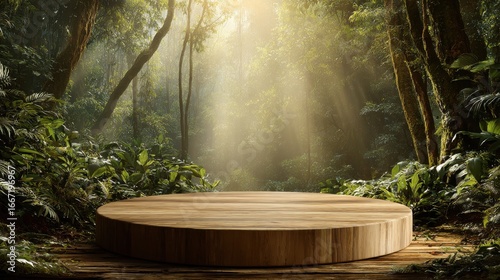 Fototapeta - Elegant photo of jungle forest background with a wooden display podium, bathed in sunshine, ideal for organic cosmetics and food presentations.