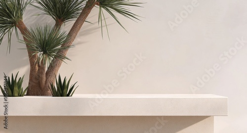 Minimalist Display Podium with Yucca Plant on Beige Background.