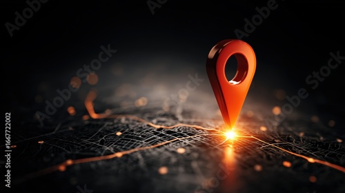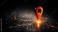 Close-up of an illuminated map marker pin on a digital map with glowing city lights and connectivity lines