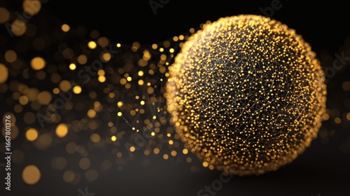 Fototapeta - Stunning close-up of a glowing golden spherical particle cluster with shimme dust particles against a dark background