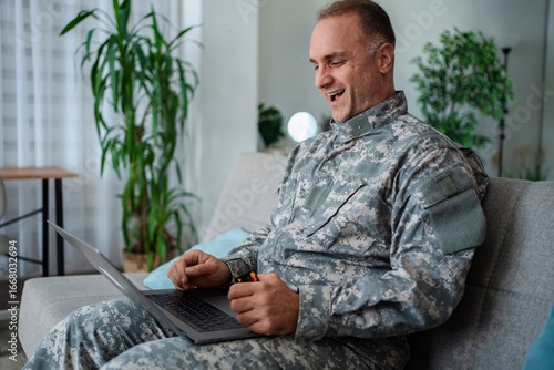 Fototapeta - Happy soldier buying online with credit card and laptop