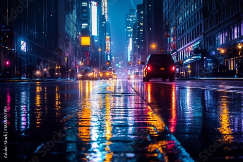 Fototapeta - Neon city street at night with glowing reflections on wet pavement creating futuristic cyberpunk urban atmosphere