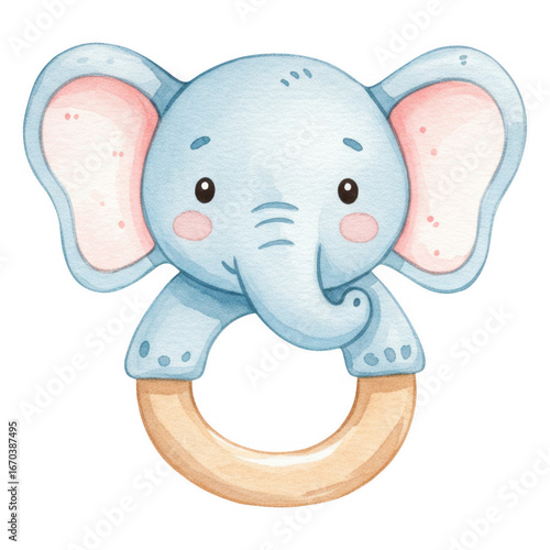 Cute watercolor blue elephant baby teether with wooden ring and pink accents transparent background