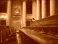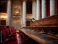 Fototapeta - Microphones and red chairs in empty parliament building, politics and debate