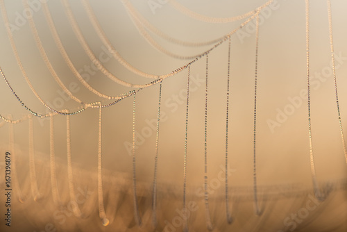 Fototapeta - Pajęczyna w kroplach rosy na łace.