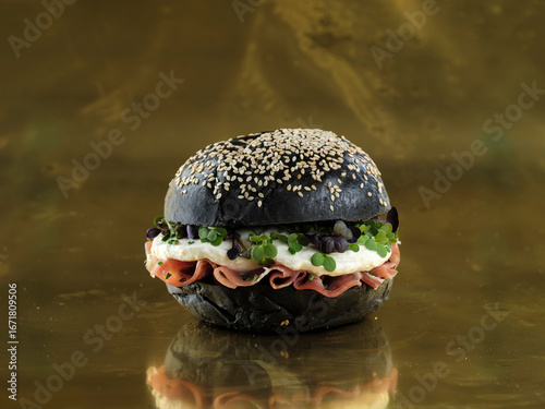 Fototapeta - a black burger with sesame seeds, filled with prosciutto, a perfectly fried egg, and vibrant microgreens. It's set against a reflective golden background