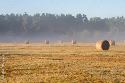 Fototapeta - Sierpniowy wschód słońca nad łąkami. Nad łąką unosi się opar mgły. Jest czas sianokosów, wśród mgieł widać bele sprasowanego siana.