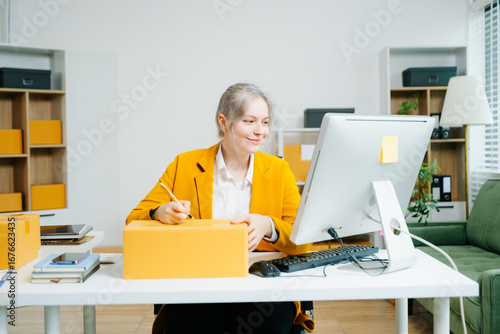 Fototapeta - Young female entrepreneur running an SME, packing products, managing online store, shipping orders, and working from home. Perfect for ecommerce, delivery, and business themes.