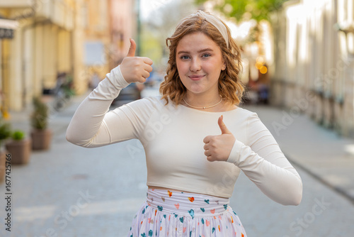 >Plakat>Like. Happy red hair woman raises thumbs up agrees with something or gives positive reply recommends advertisement likes good idea feedback celebrating success victory outdoors. Girl in city street.
