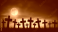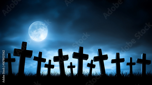 Fototapeta - A row of crosses are lined up in a field, with a full moon in the background