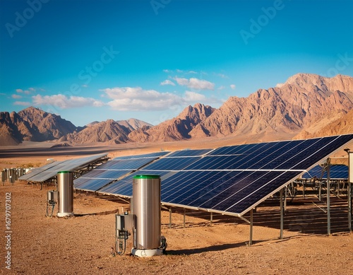 clean energy solar startup concept solar panels and storage units in a desert landscape with mountains in the background