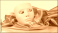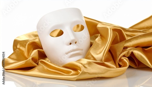 Fototapeta - White theatrical mask resting on golden satin fabric, evoking mystery and elegance