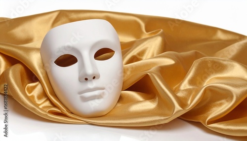 Fototapeta - White theatrical mask resting on golden satin fabric, evoking mystery and elegance
